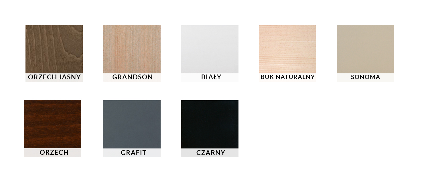 - Kolory drewna i tapicerki do wyboru na dole oferty