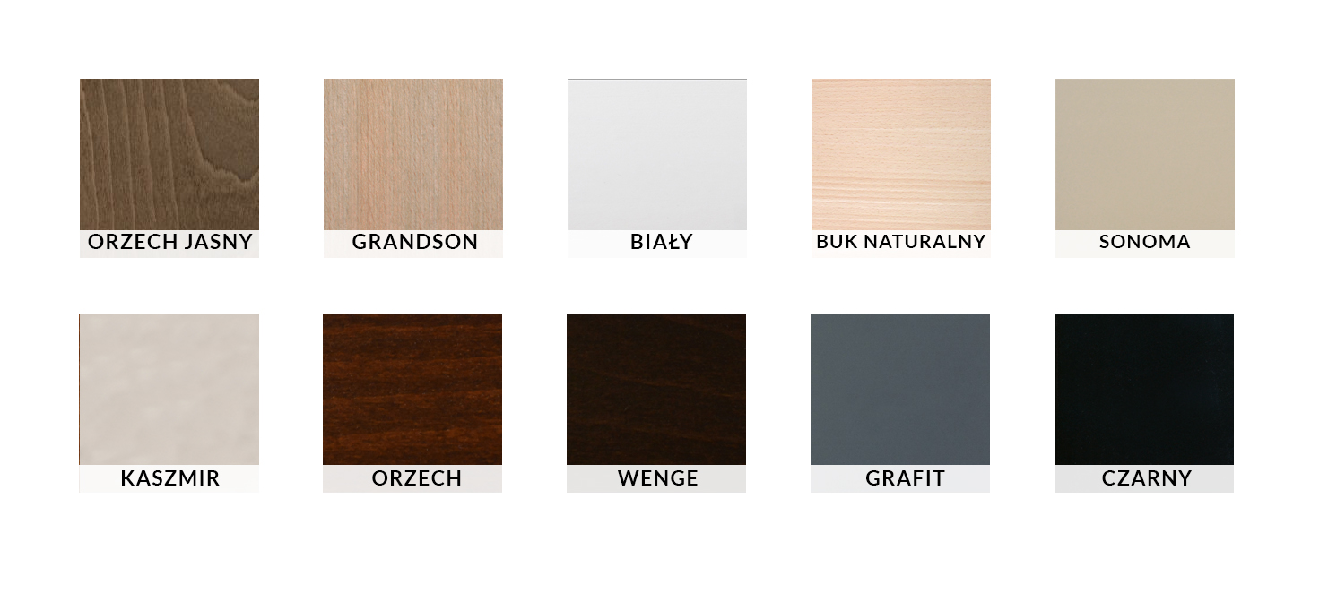 - Kolory drewna i tapicerki do wyboru na dole oferty