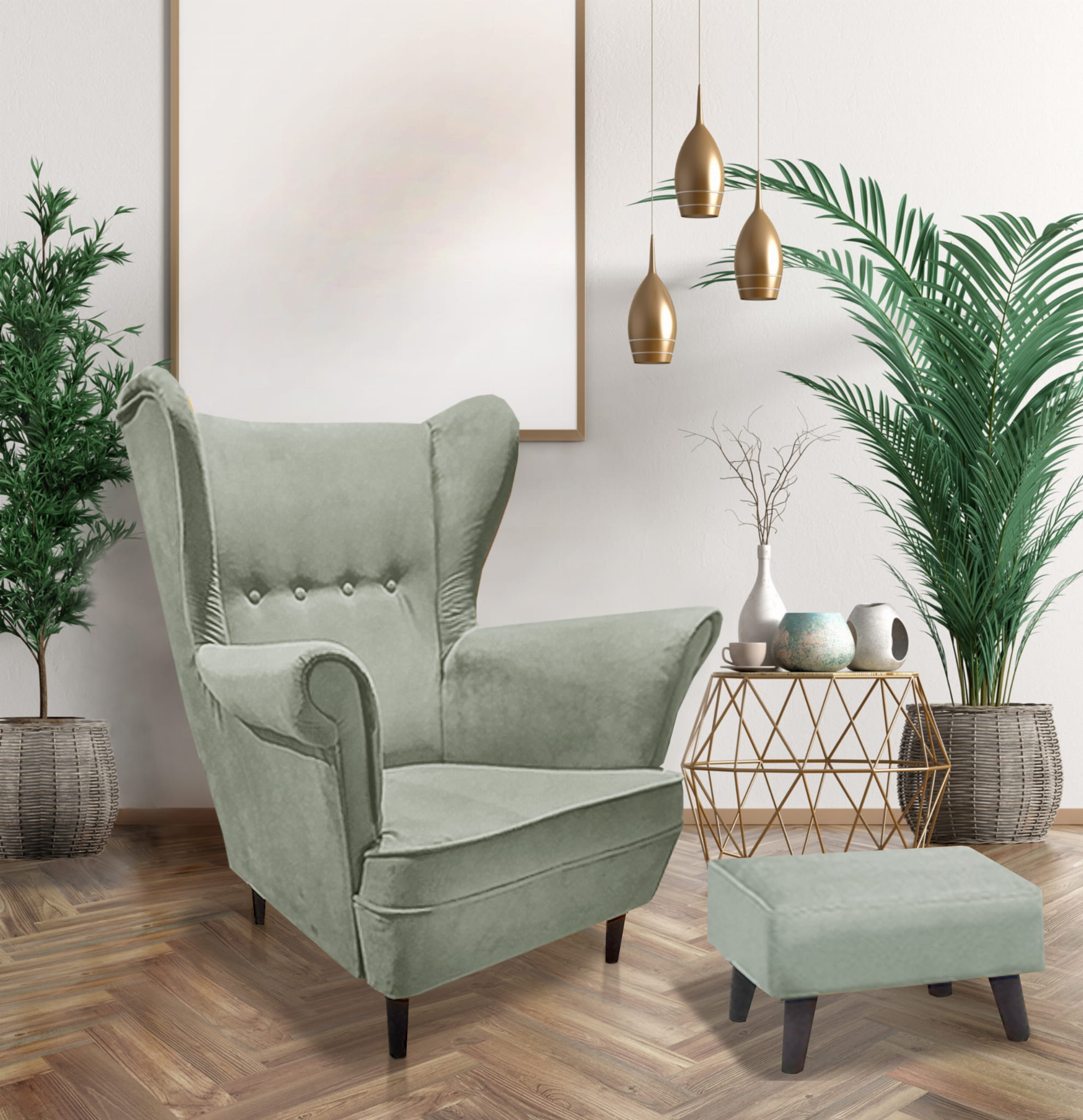 Fotel Uszak w Skandynawskim Stylu z Podnóżkiem "Zielony"