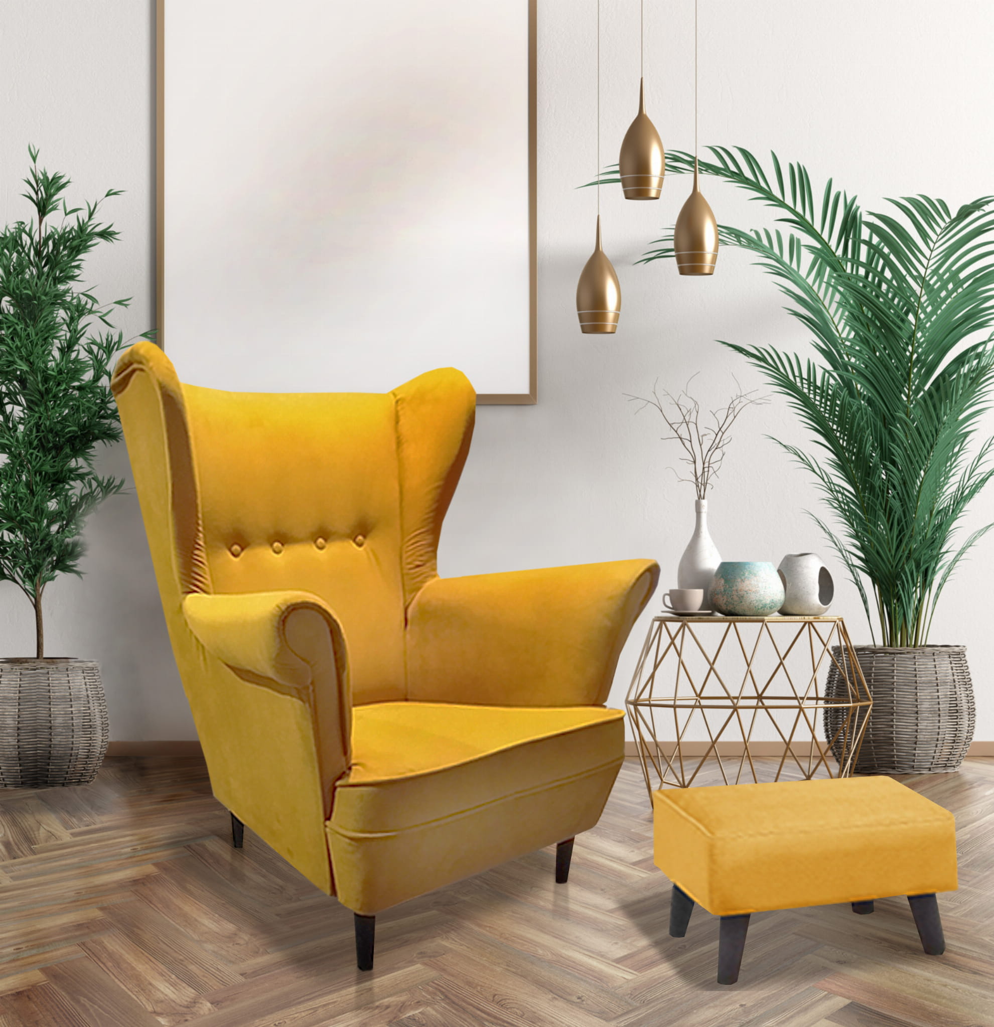 Fotel Uszak w Skandynawskim stylu z Podnóżkiem "Żółty"