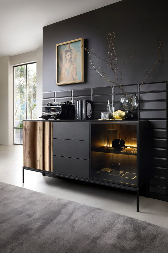 KOMODA SALON POKÓJ BIURO CZARNY/DĄB WOTAN 154x83x39 SENTA nowoczesne meble