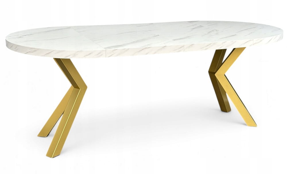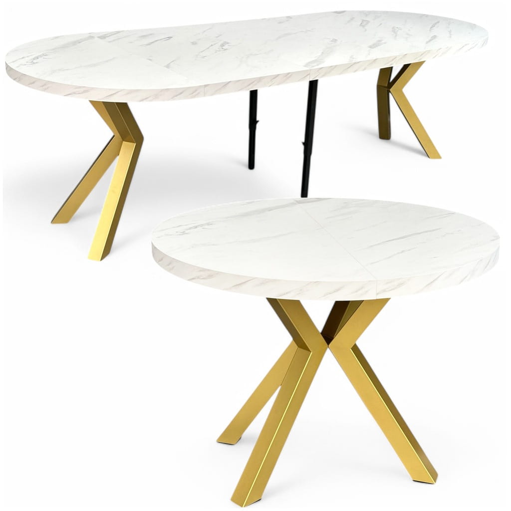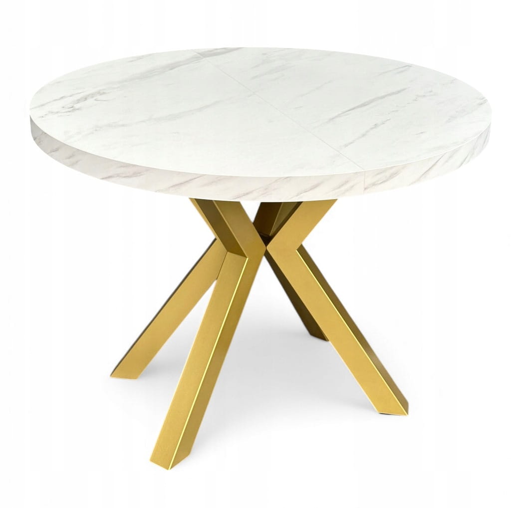 Stół duży okrągły MARMUR BIAŁY rozkładany Ø100/300 cm ZŁOTE NOGI METAL X