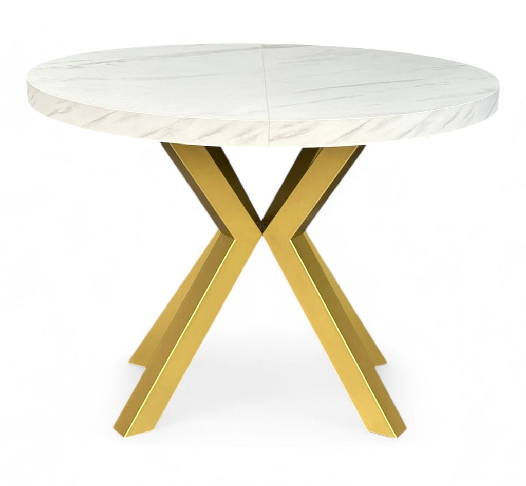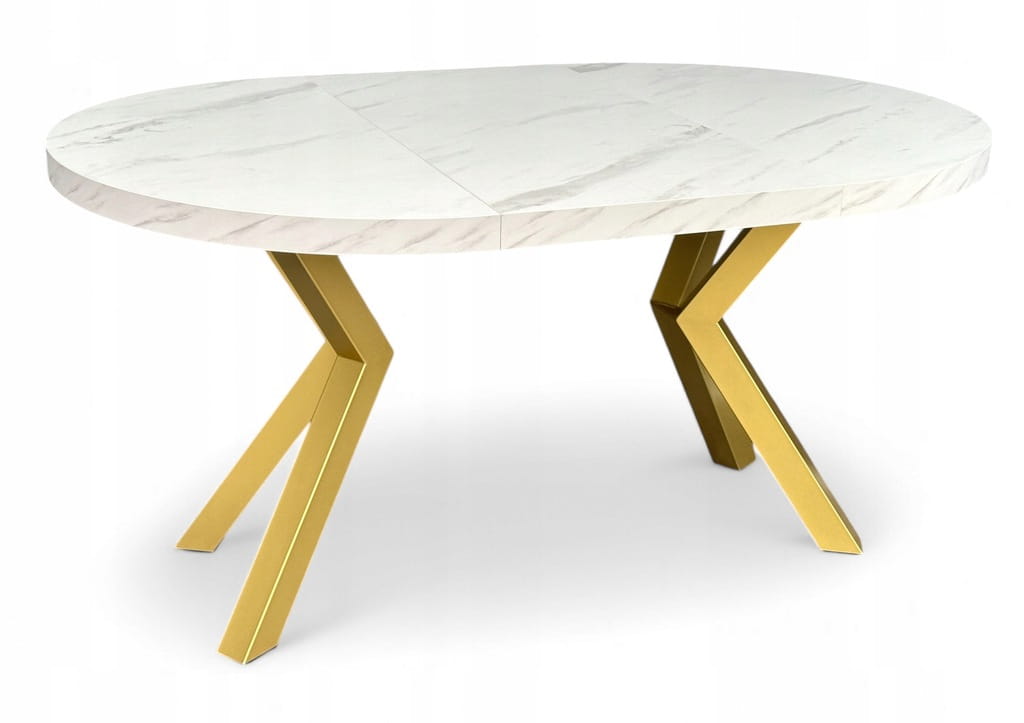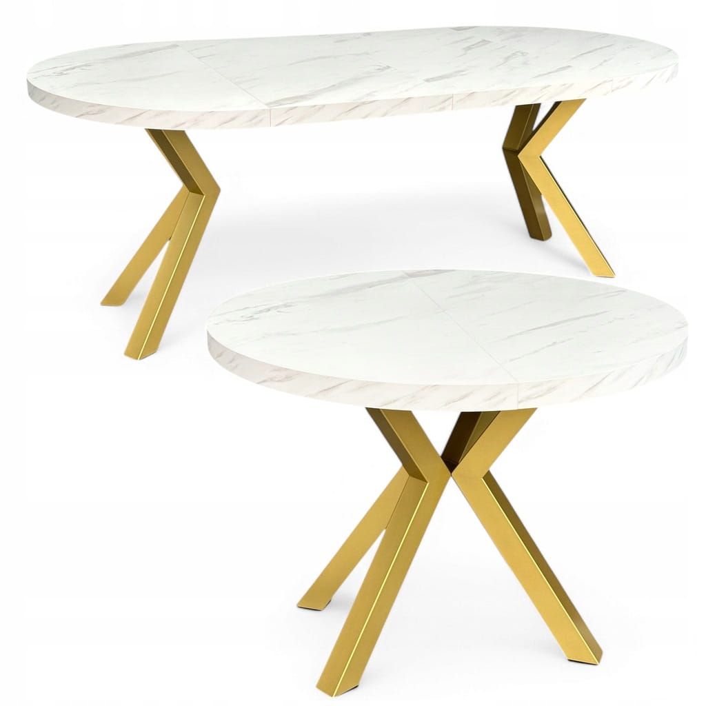 Stół okrągły MARMUR BIAŁY rozkładany Ø110/210 cm ZŁOTE NOGI METAL X
