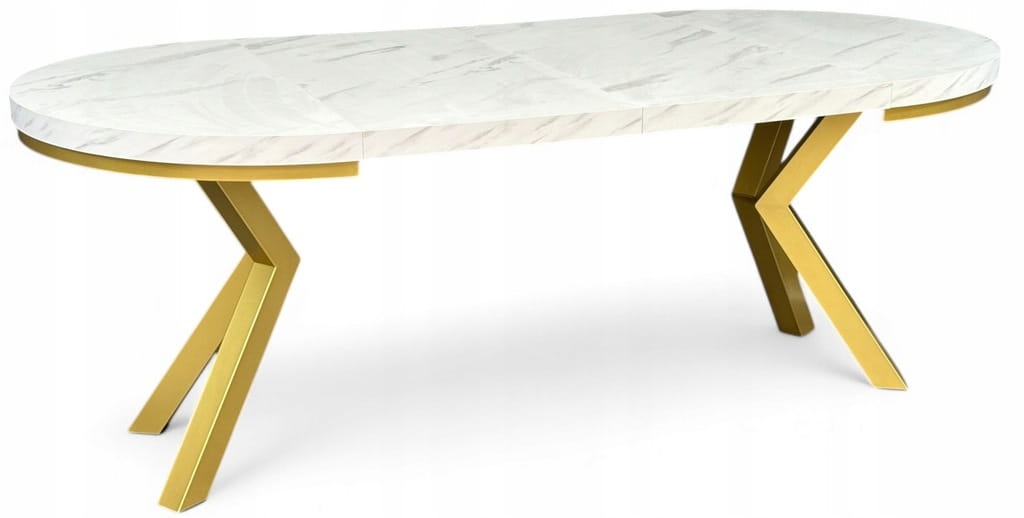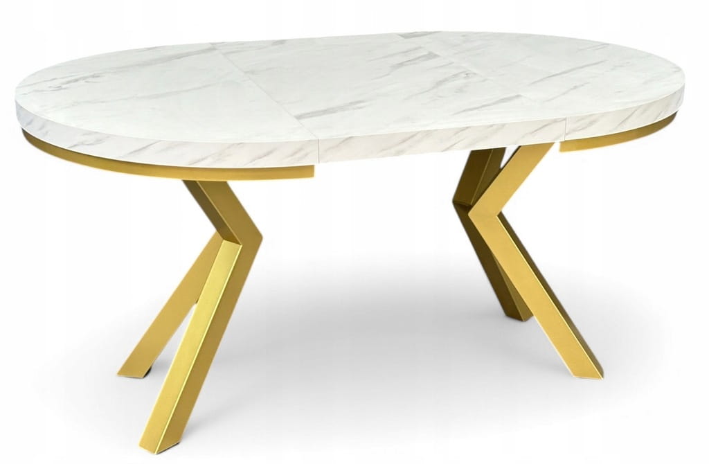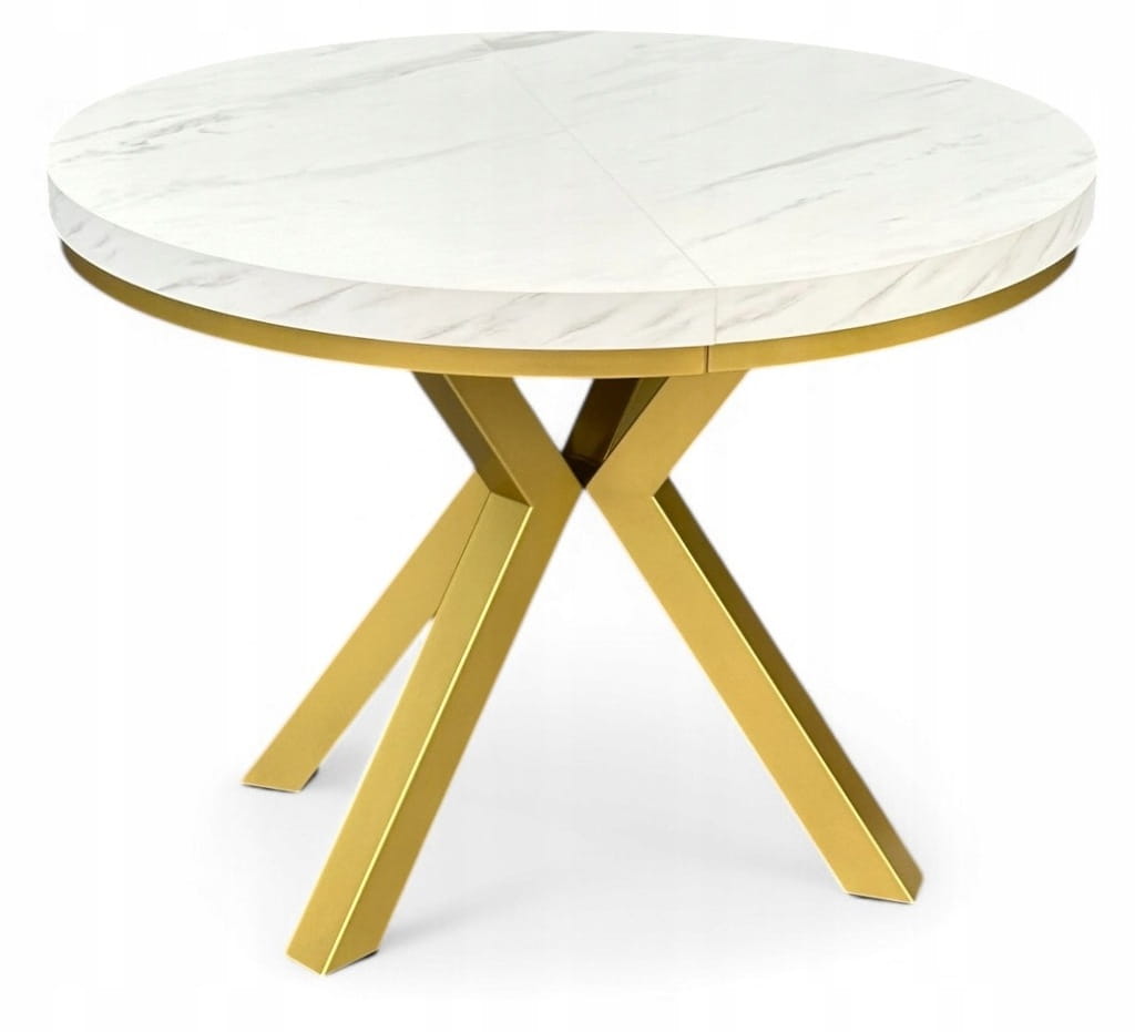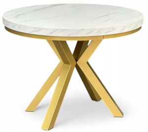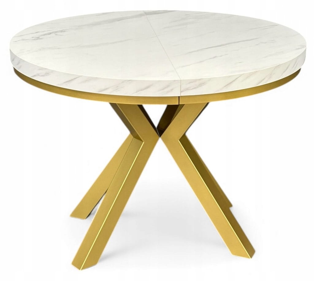 Stół okrągły rozkładany Ø110/210 cm nogi X złote + biały marmur + maskownica