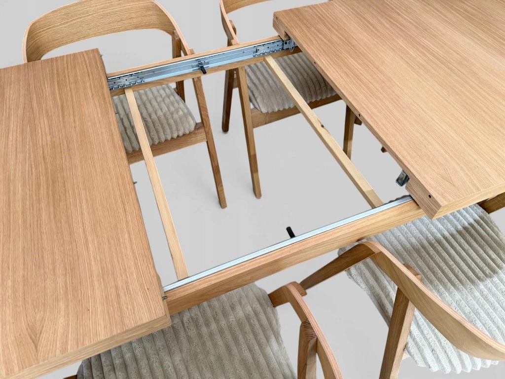 - stół z blatem fornirowanym jest tańszy niż w całości wykonany z litego dębu, ale nadal zachowuje elegancki wygląd mebla z prawdziwego drewna.